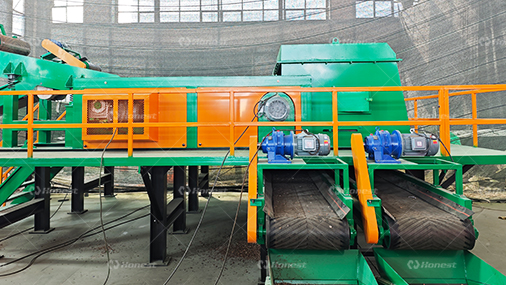 The shredded materials are then transferred via conveyor to a hammer crusher, where they are crushed into smaller, uniform particles.